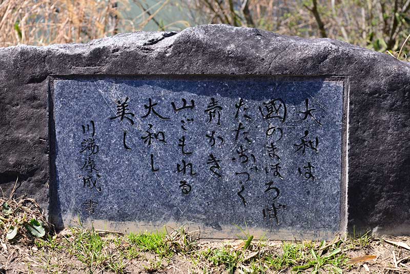 道の各所に小さな歌碑がある。ほとんどが『古事記』や『万葉集』に収められている古い歌だ。柿本人麻呂の歌が多いのは、彼の妻か愛人がこのあたりに住んでいたからだという説があるらしい。まあ、千年以上も昔の人の恋路を詮索するのは慎むことにして、一つ歌を読んでみよう。