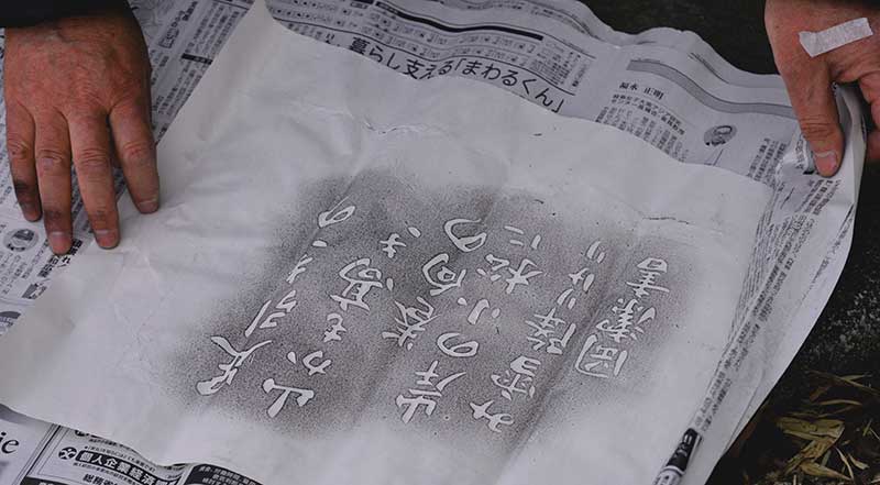 拓本を採る人。普通に写せば文字は反転してしまう。なかなか熟練の技と見た