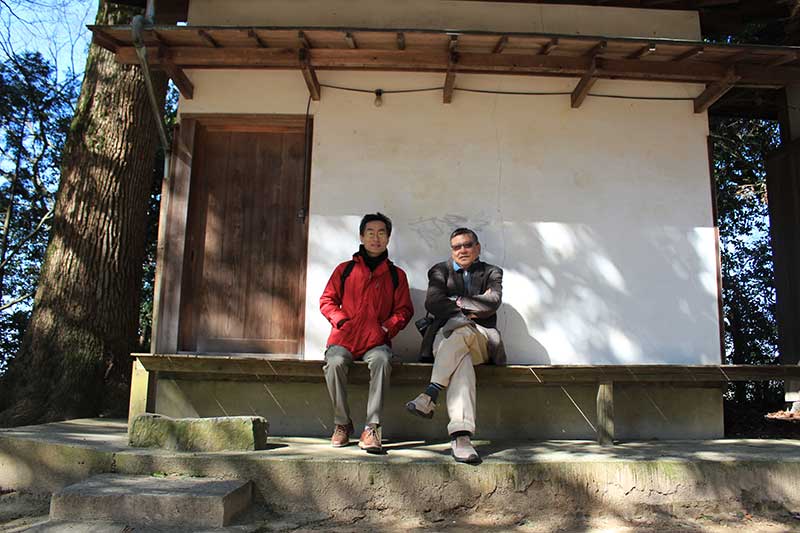 小平さんと2ショット。小さな神社の小さな境内。神様たちの遊び場みたいなところで、すっかり和んでしまった(夜都伎神社)