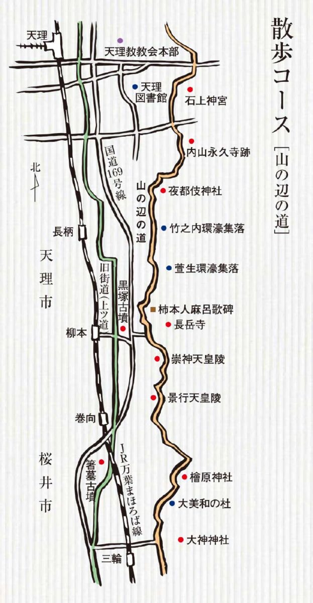 大和平野の東側、三輪山の山裾を縫って南北に延びる道を「山の辺の道」と称する。石上神宮を出発点として、仏教伝来の地である海柘榴市まで、約十一キロの行程である。最古の部類に入る前方後円墳がこんもりとした山をなし、悠久の昔から在りつづけた神社や寺が、いまも当時の面影のままに在りつづける。廃仏毀釈で廃寺となったところも、寺跡として、やはり在りつづけている。歴史が幾層にも積み重なった場所で、人々は畑を焼き、作物を育て、暮らしを営んでいる。この風景は、万葉の時代から、それほど変わっていないのだろう。