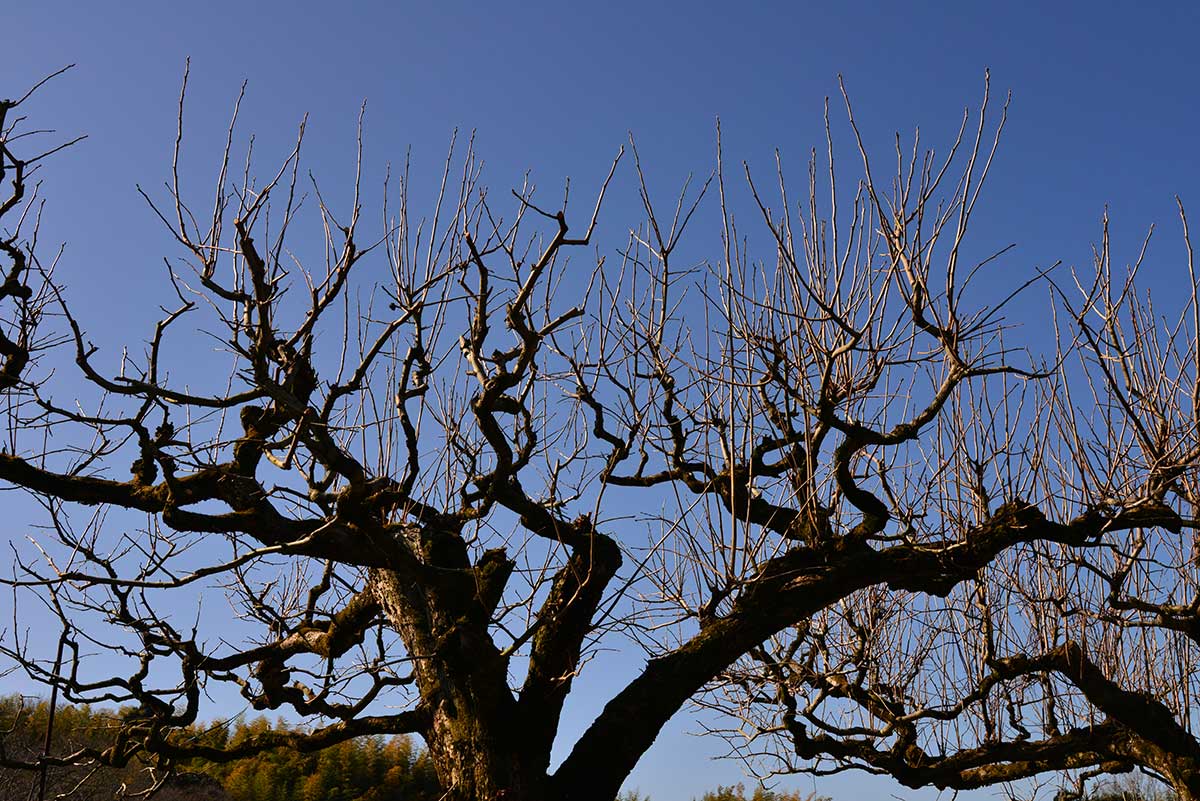 竹林を渡る風はやさしく、どこからともなく甘い花の香りを運んでくる。低く剪定された柿の木は、芽吹きにはまだ少し早い。複雑に折れ曲がった枝を四方八方に伸ばしながら、雲一つない空の下に並んでいる様子は、さながらモダンなオブジェのようだ。