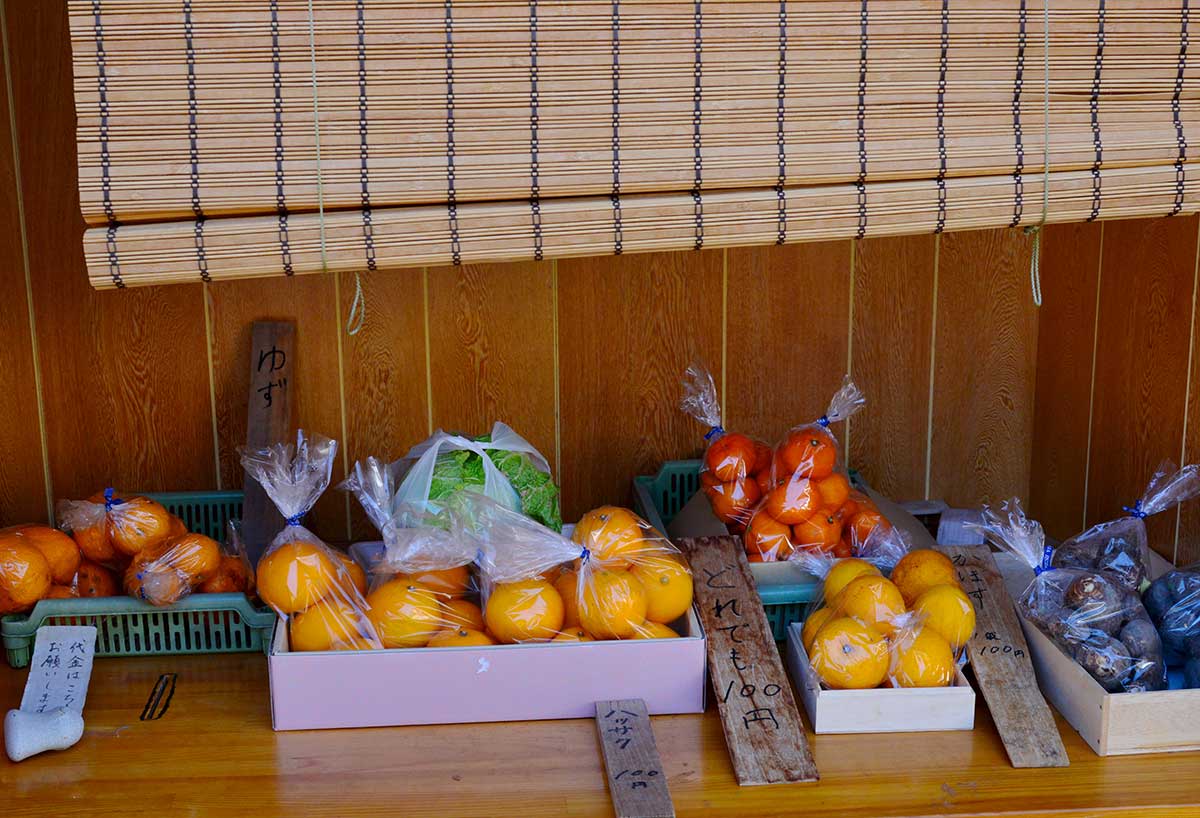 道端に無人の店が出ている。里芋も大根もカボスも、どれも一盛り百円、一袋百円で無造作に置いてある。もちろん番をしている人などはいない。このあたりでは猫だけでなく、人まで無防備なようだ。いいなあ。ぼくはお金を入れて、八朔を一袋買った。こんなポトラッチみたいなことが成り立つのは、ベーシックなところで人と人の信頼関係が損なわれずにあるからだ。そうした信頼の基盤が、いまの日本では急速に失われつつある……といったことは、いまは考えないことにしよう。